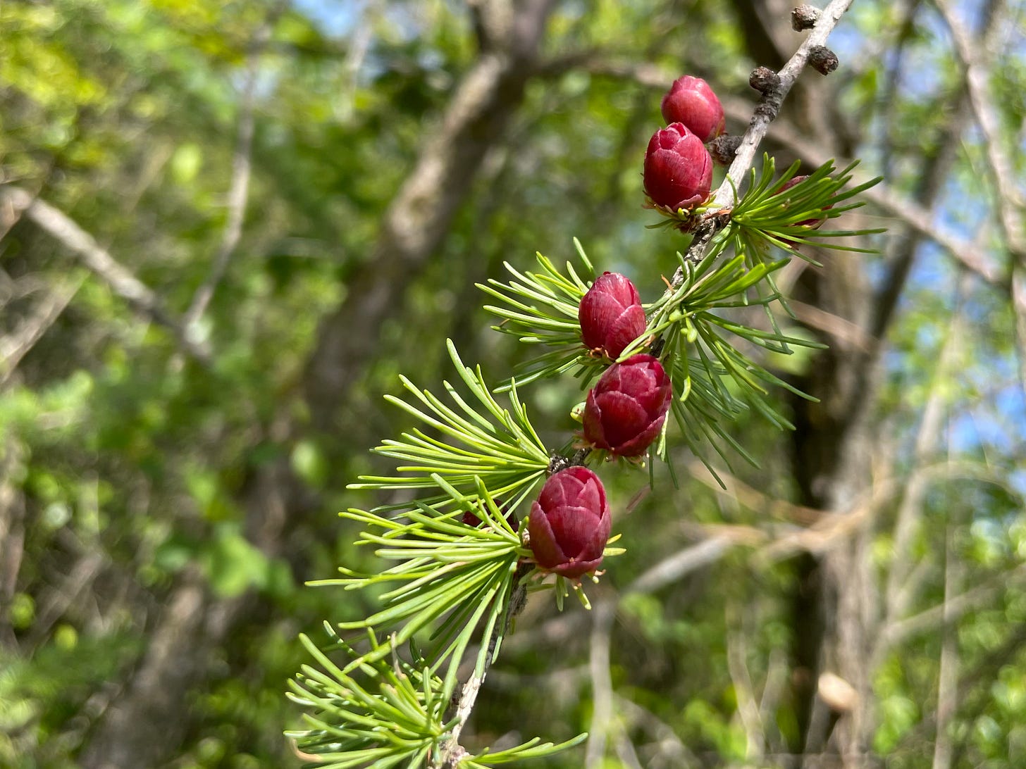 Over the next week, I couldn’t get the thought of rose-colored cones out of my head. Another excursion up north was out of the question, so I set my sights closer to home. Perhaps being 300 miles south would mean my local tamaracks were a few weeks ahead of their Northwoods cousins in the growing cycle—but not so far ahead that the color I sought would already be fading.