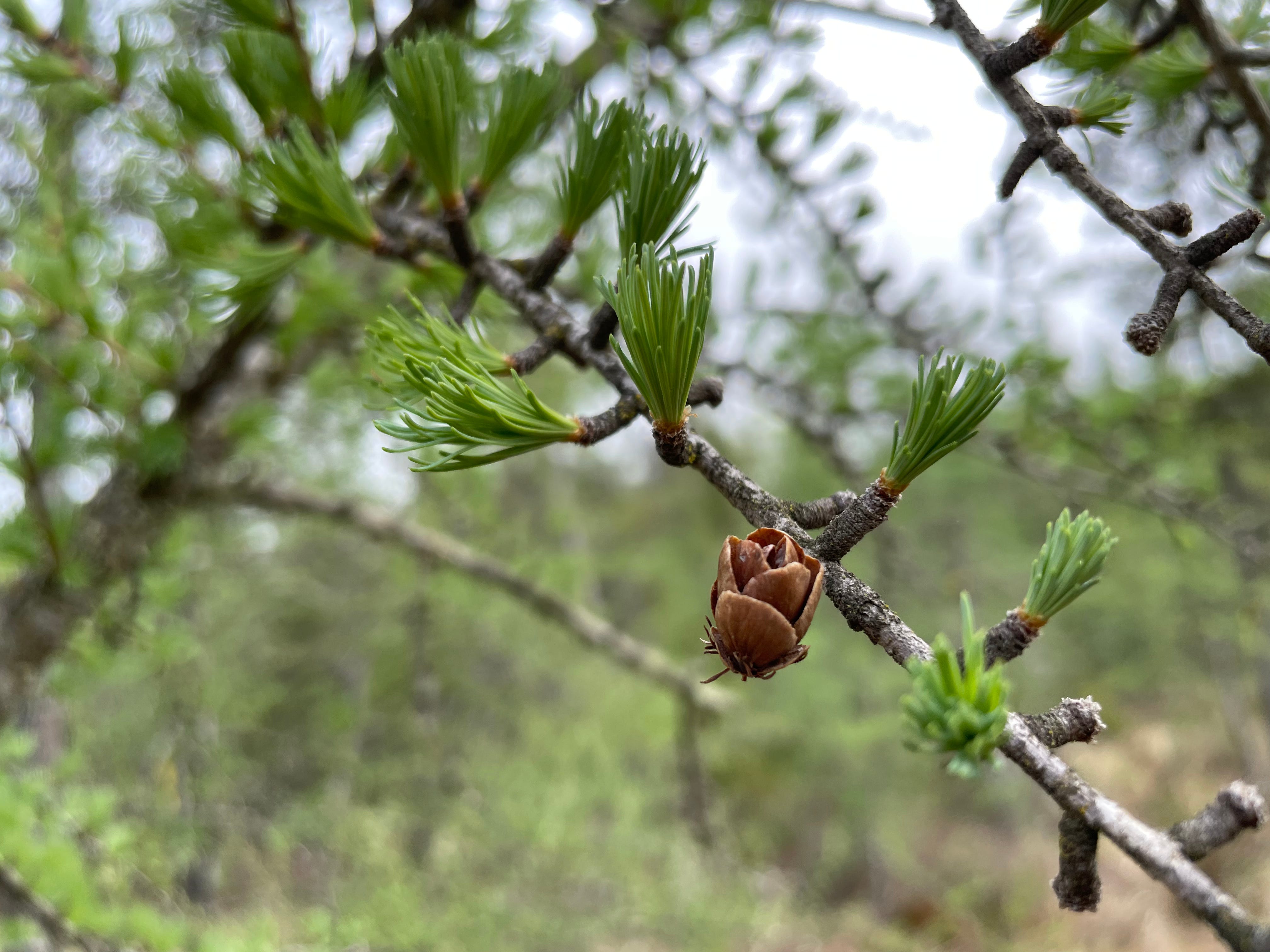 This time there was no smoky gold beckoning me closer; the freshly sprouted needles were as bright green as a fern. It’s easy to overlook changes in an evergreen conifer—the growth of a hemlock or pine is invisible to most who wander past—but the tamarack always has something going on. It’s a tree that rewards you for stopping to consider it, season after season. After a bare-branched winter, merely growing new needles isn’t impressive enough for this deciduous conifer, so it pulls out all the stops with its cones.