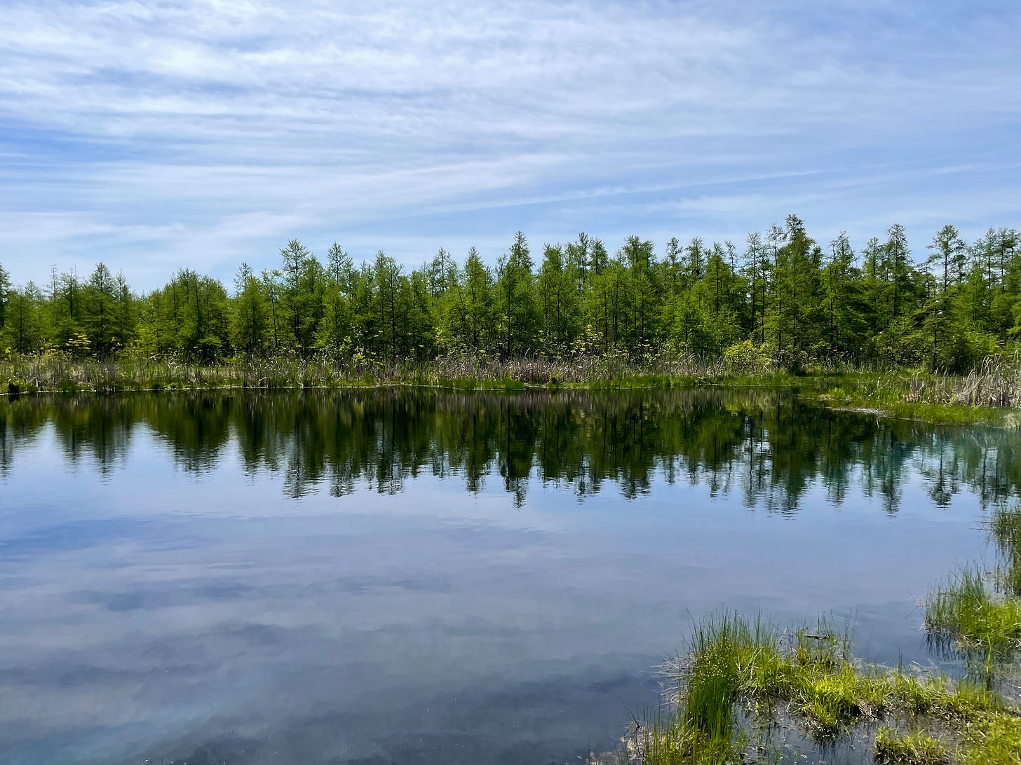 The group finally came into view, heralded by the child’s chant of, “Eye of the bog! Eye of the bog!” I pretended to be deep in concentration while I snapped a photo of the open water.5 Then, as casually as I could manage, I made eye contact with the parents and said, “If you like tamaracks, there are great examples of the rose-colored cones on the branch right behind you.”